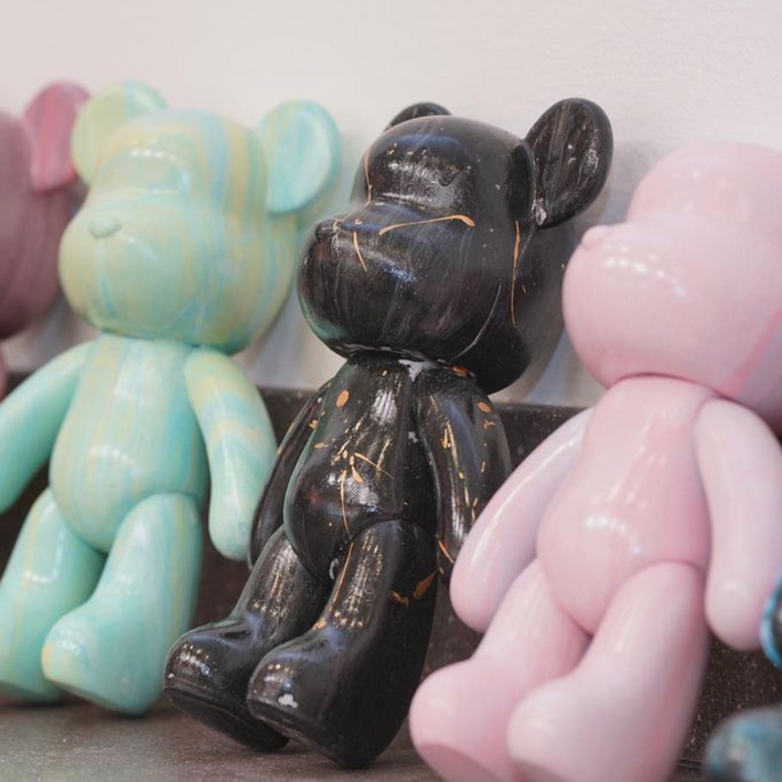 Mix colors of acrylic fluid paint to create your own bear statue or keychain. Enjoy the fun and soothing process of paint pouring and leave with something special and unique!